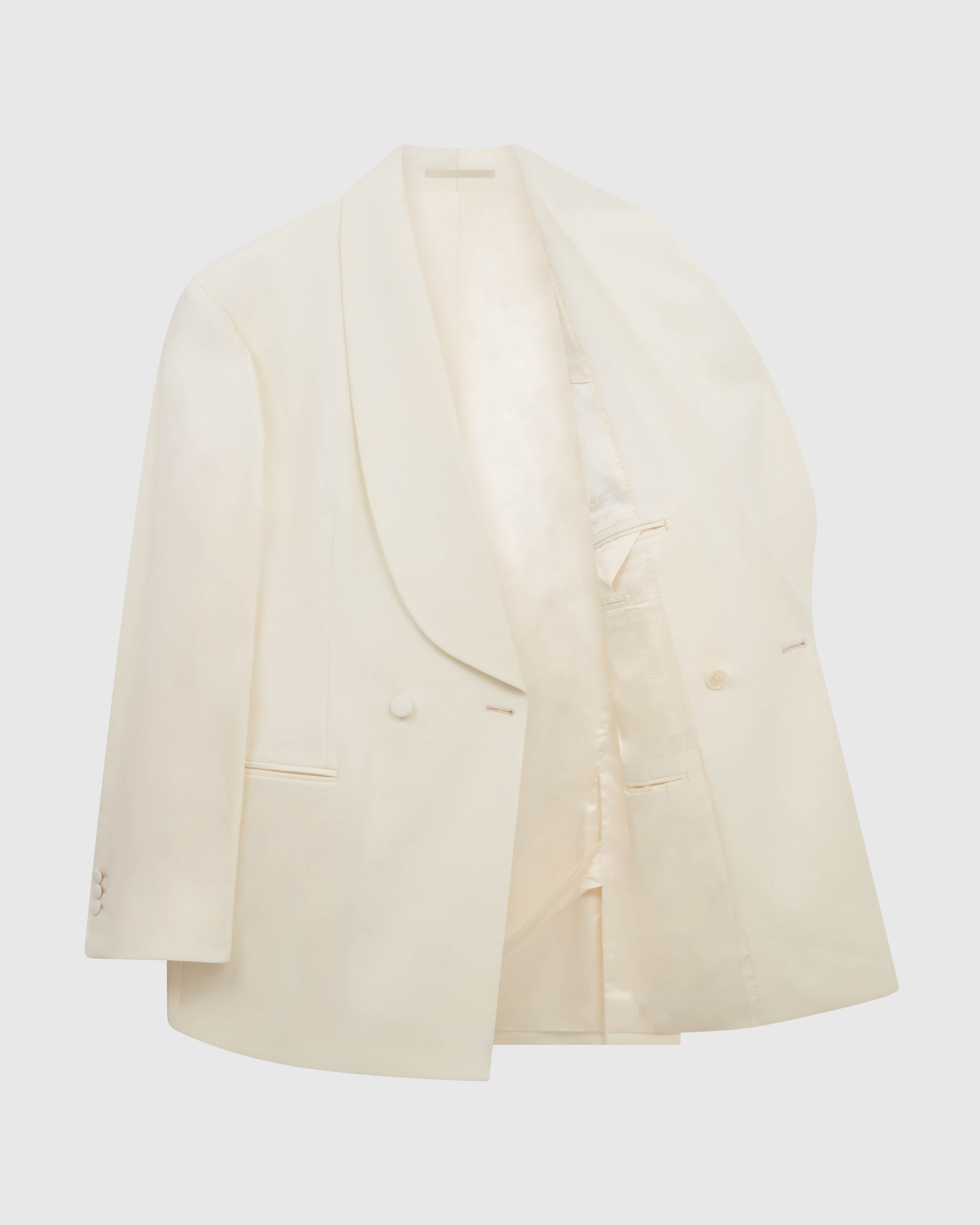 Custom Made ivory tuxedo jacket in Italian cashmere & wool with self-faced lapels. Paired with black Italian barathea trousers to a form a classic black tie look.