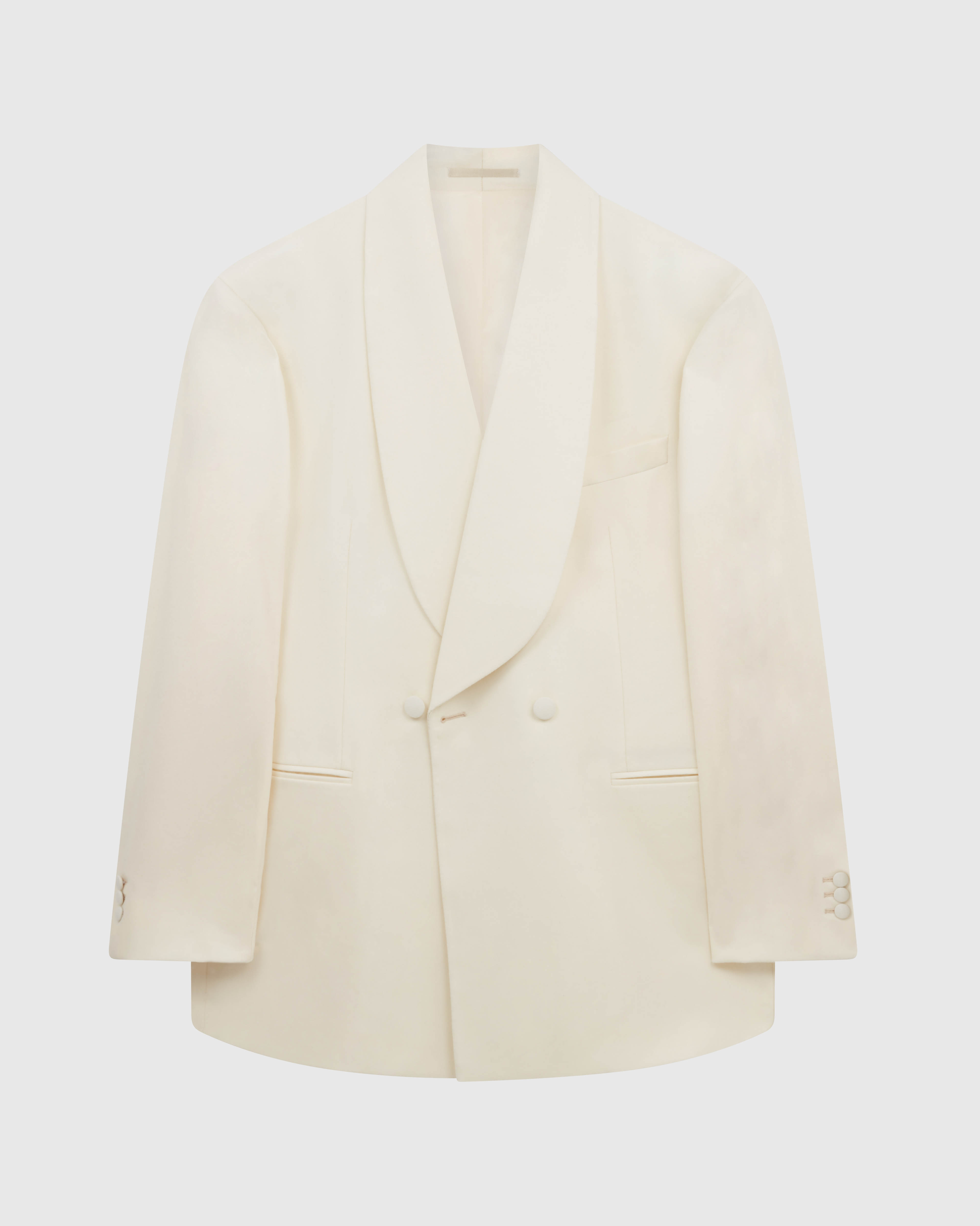 This piece is cut in a classic double-breasted style with a shawl lapel.